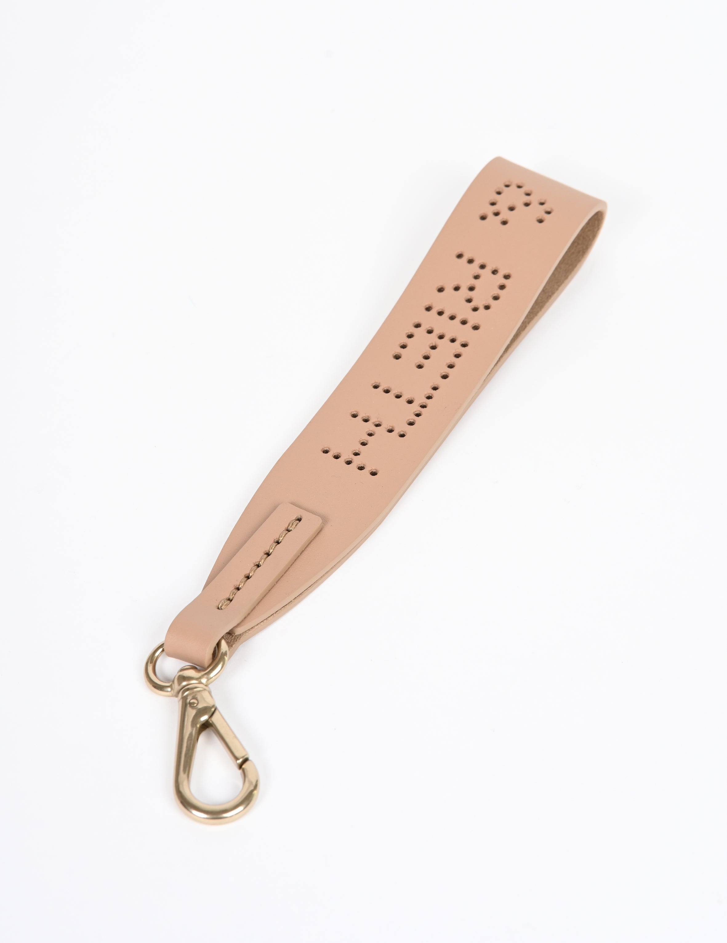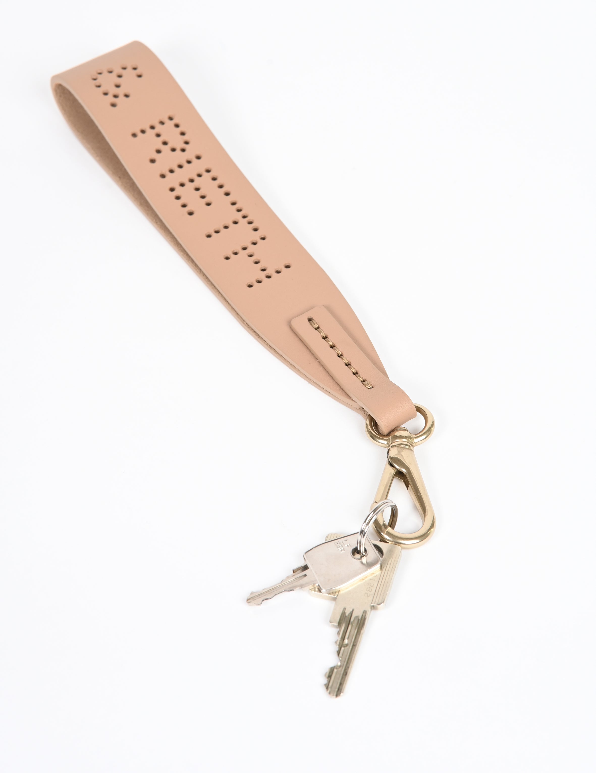 Schlüssel- und Taschenanhänger mit Messingkarabiner und Griffschlaufe mit gepunchtem Logo und Handnaht.