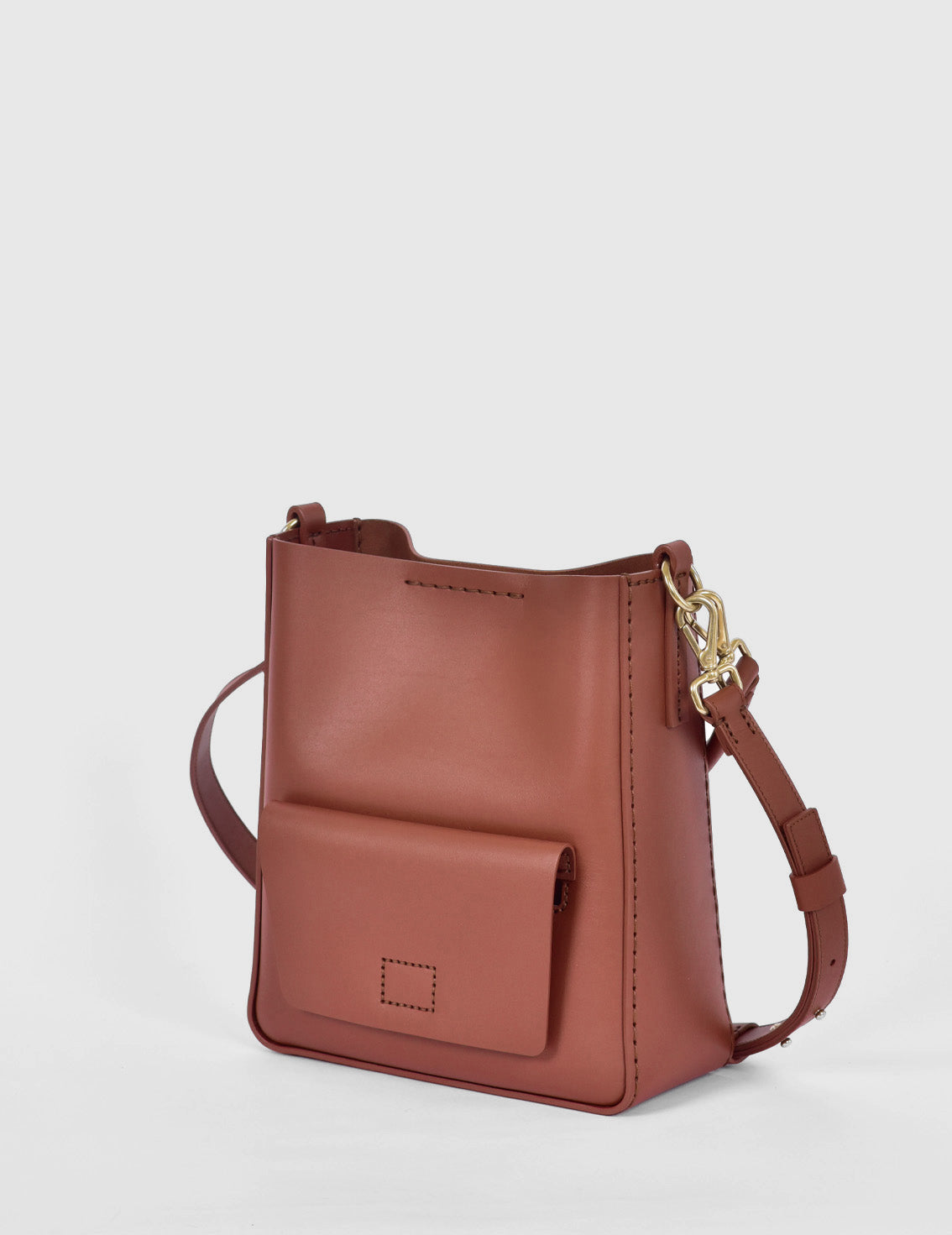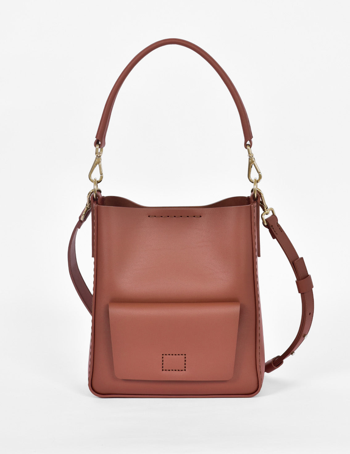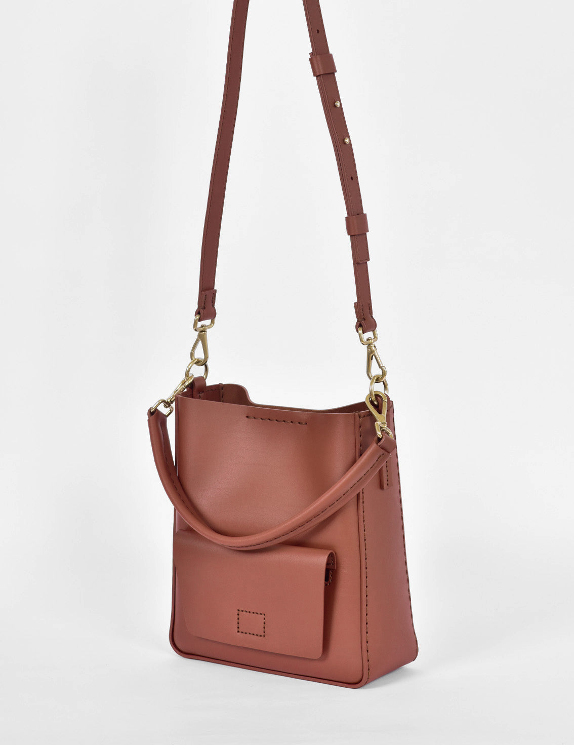 Hochformatige, grafische handgenähte Schultertasche aus geschmeidigem Rindleder mit Vortasche. Die CADDY kann 'crossbody' oder kurz mit dem handgenähten konisch verlaufenden Kurzriemen getragen werden.