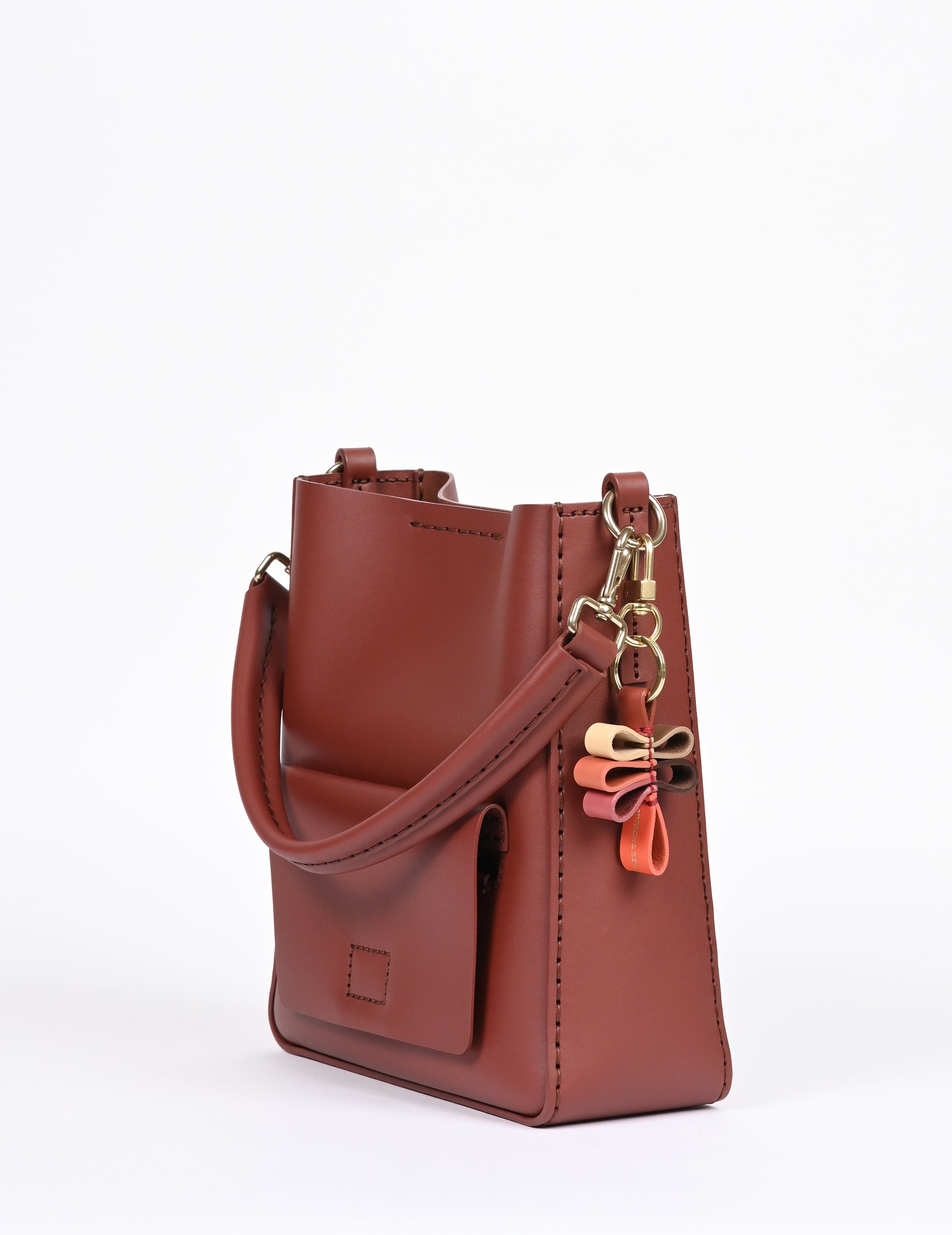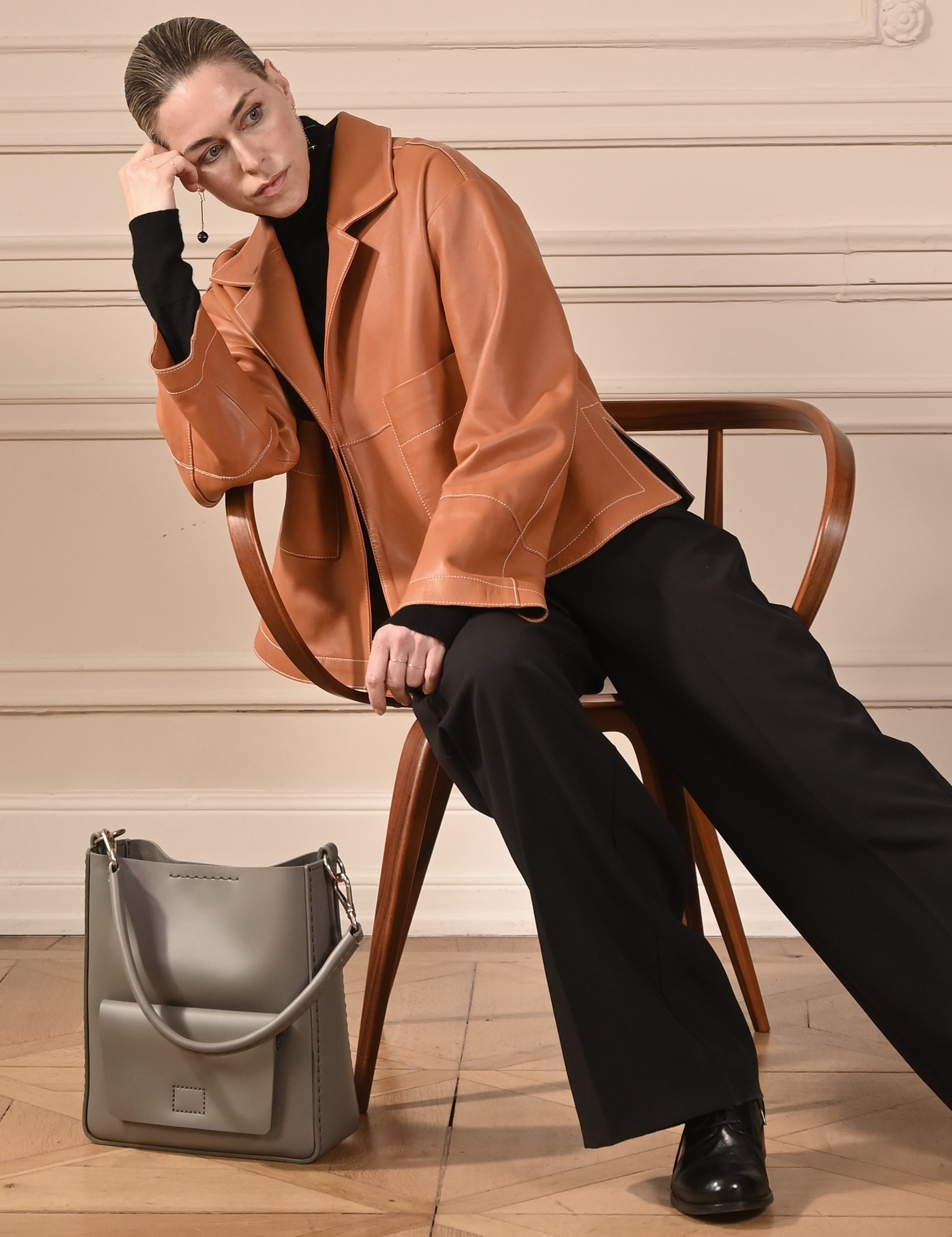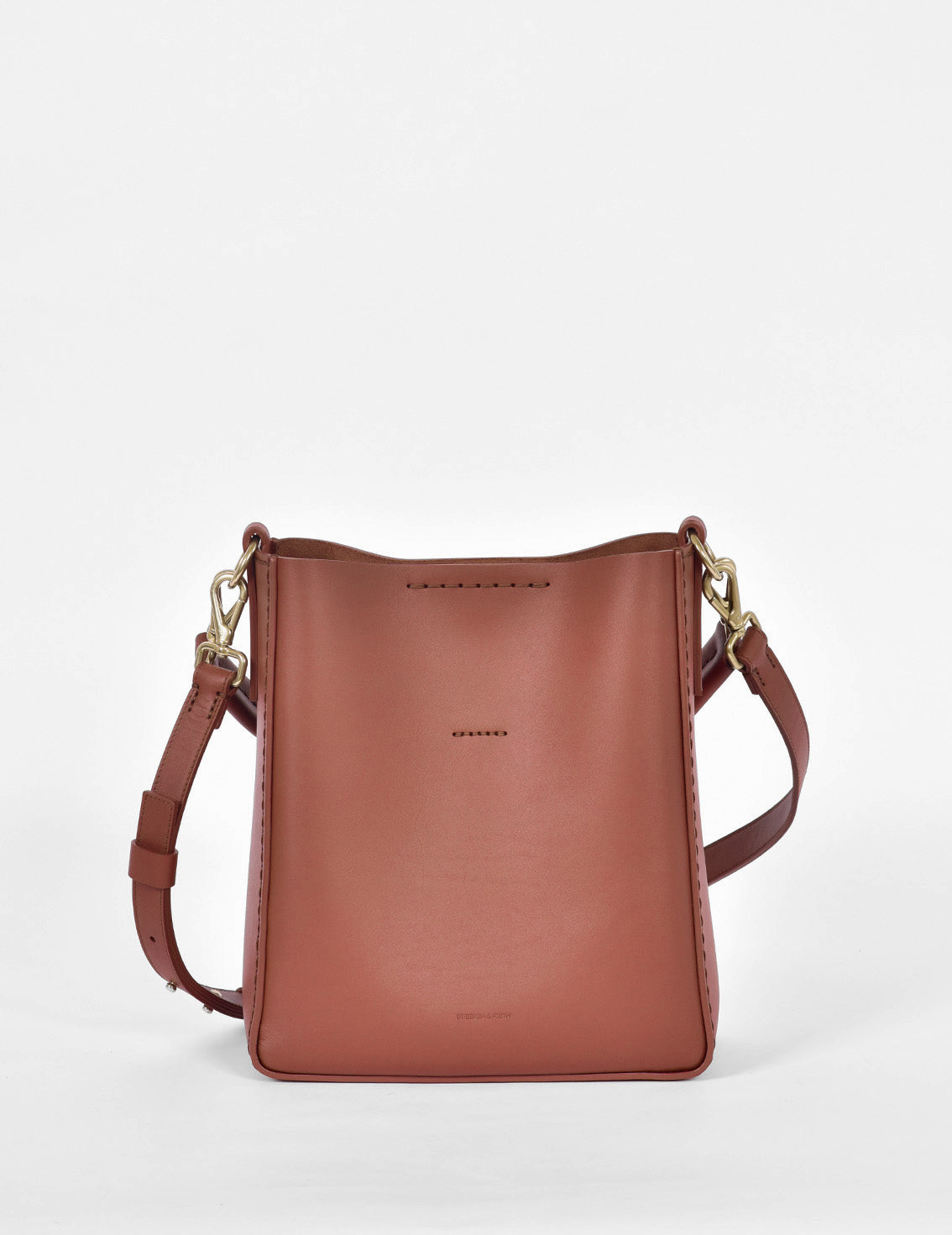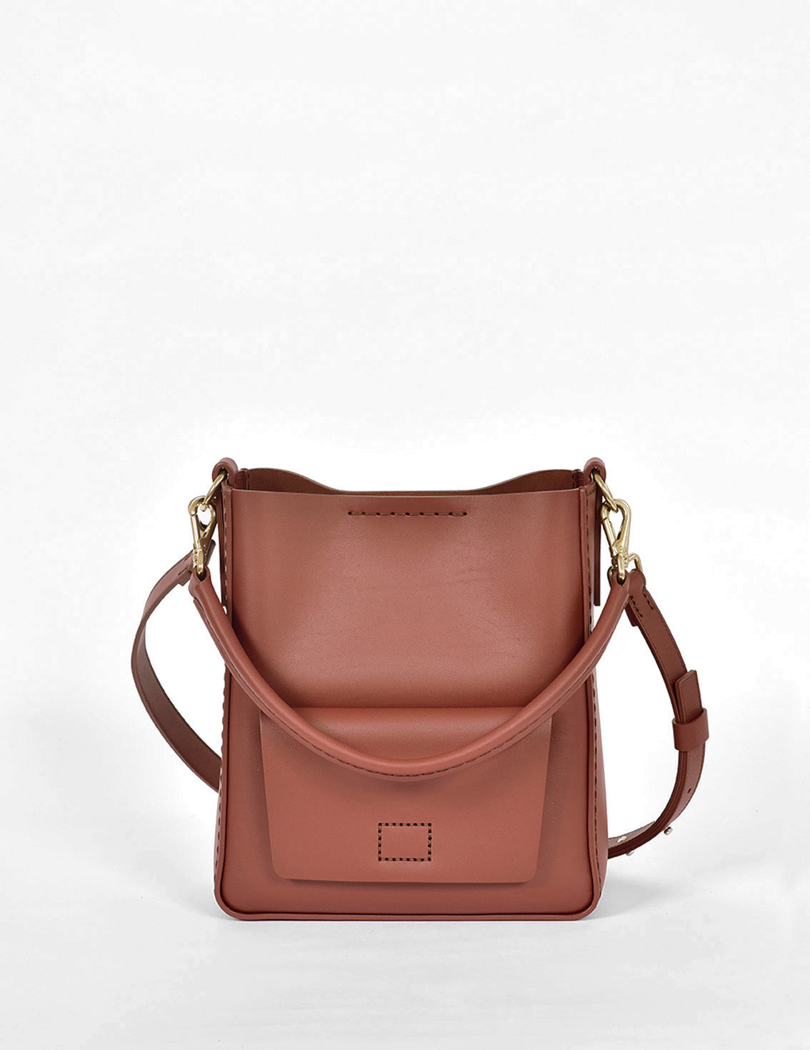 Hochformatige, grafische handgenähte Schultertasche aus geschmeidigem Rindleder mit Vortasche. Die CADDY kann 'crossbody' oder kurz mit dem handgenähten konisch verlaufenden Kurzriemen getragen werden.