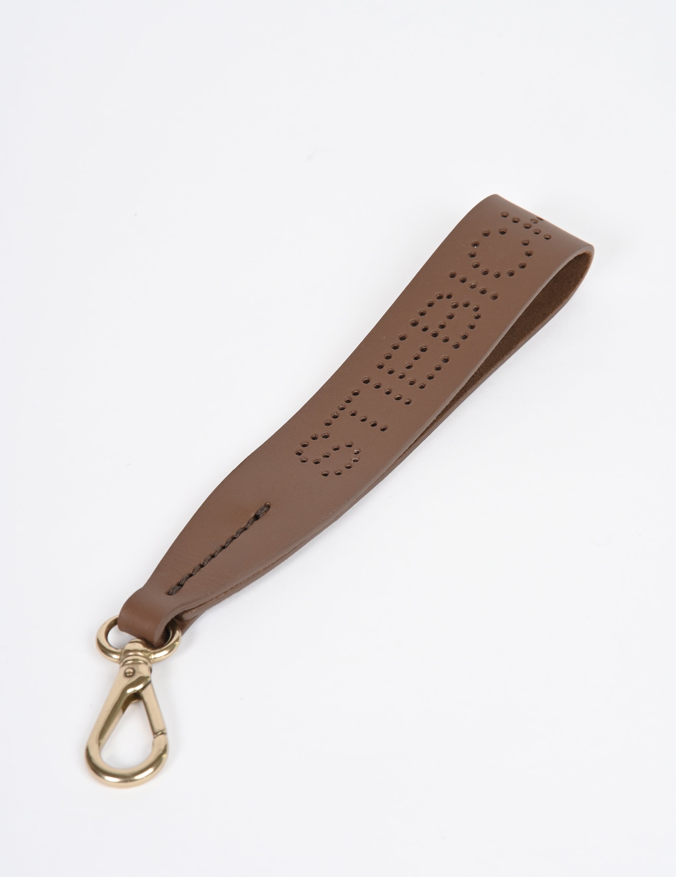 Schlüssel- und Taschenanhänger mit Messingkarabiner und Griffschlaufe mit gepunchtem Logo und Handnaht.
