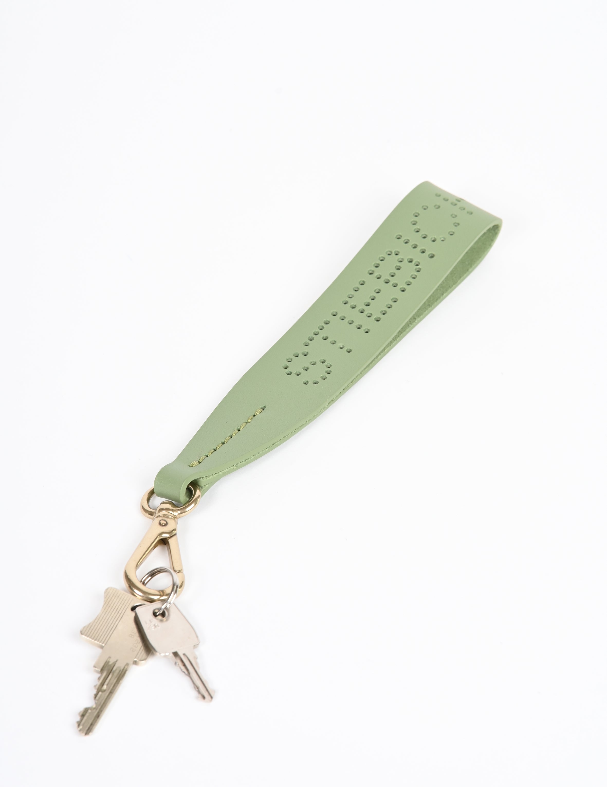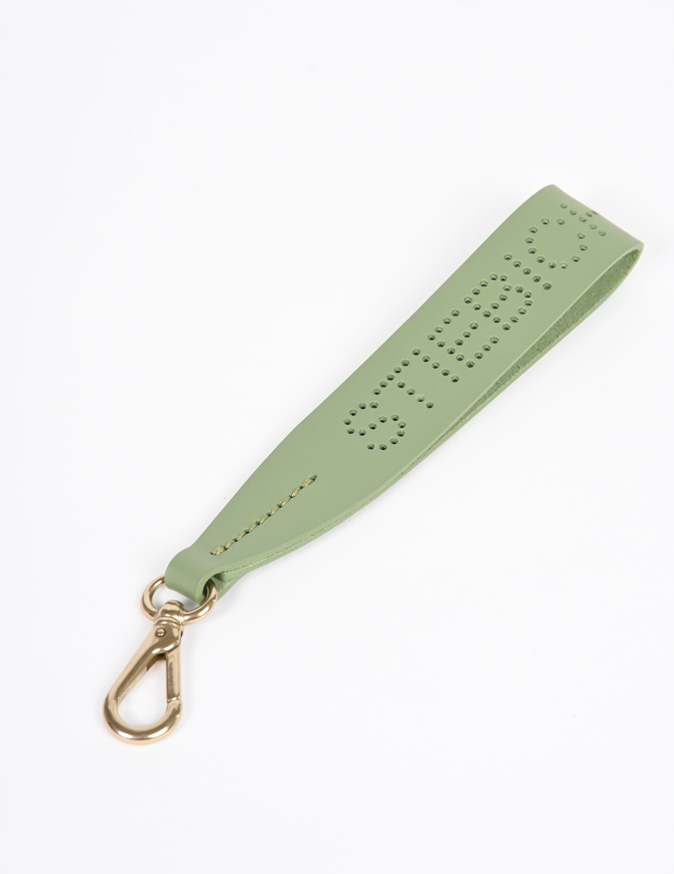 Schlüssel- und Taschenanhänger mit Messingkarabiner und Griffschlaufe mit gepunchtem Logo und Handnaht.